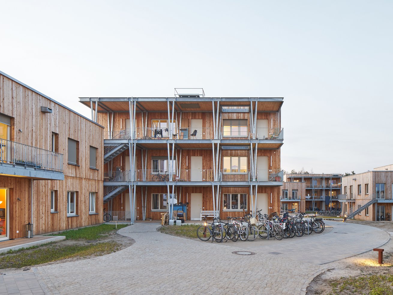 In Bad Belzig zeigt das Projekt „LIF – Leben im Fläming“ eine alternative Wohnform jenseits der typischen Einfamilienhaussiedlungen. Auf engem Grundstück entstehen geschickt angeordnete Wohn- und Gemeinschaftshäuser, die vielfältige Freiräume schaffen und zugleich einen sparsamen Umgang mit Fläche demonstrieren. Grundlage des Quartiers ist ein stark ausgeprägter Gemeinschaftsgedanke, getragen von einer soziokratischen Organisationsstruktur, die Mitverantwortung und Teilhabe fördert. Die nachhaltige Holzbauweise, das zirkuläre Energiekonzept und der weitgehend fossilfreie Betrieb setzen ökologische Standards. Flexible Wohnungsgrößen, großzügige Veranden und gemeinschaftlich finanzierte Häuser – teilweise offen für die Nachbarschaft – schaffen ein robustes Modell für gemeinschaftliches, zukunftsorientiertes Wohnen.