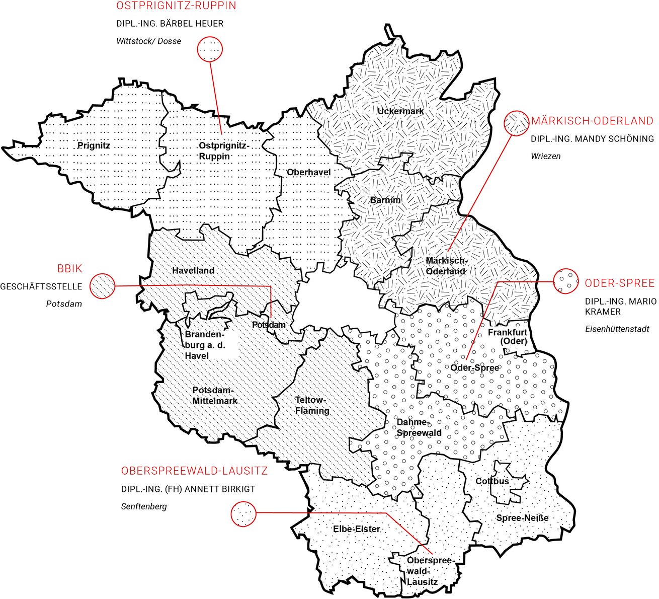 Die Regionalen Beratungsstellen dienen als direkte Ansprechpartner für Kammermitglieder und Kammerinteressenten innerhalb des Bundeslandes Brandenburg, die so auf kurzem Weg ihre Anfragen und Anregungen auch dort direkt vorbringen können.