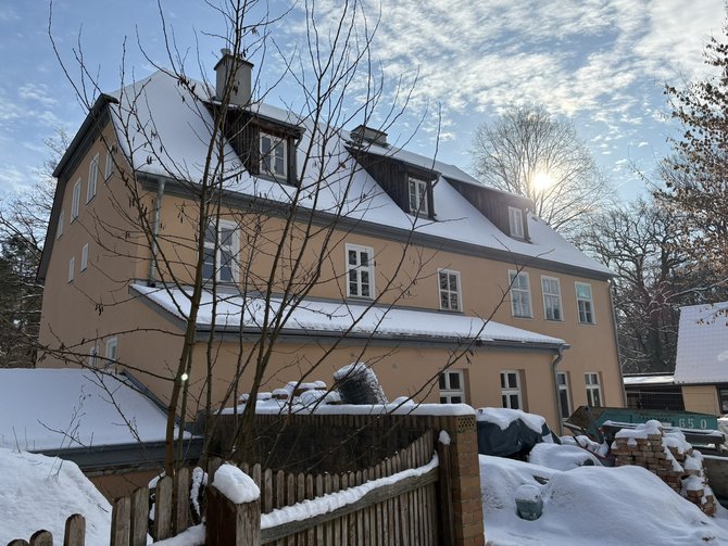 Bei der Sanierung gemäß KfW Denkmal100 wird besonderes Augenmerk auf erneuerbare Energie und nachhaltige Baustoffe gelegt. Zur Beheizung wird Erdwärme genutzt. Fehlende Fliesen und Dielung werden durch historische Baustoffe ergänzt.
